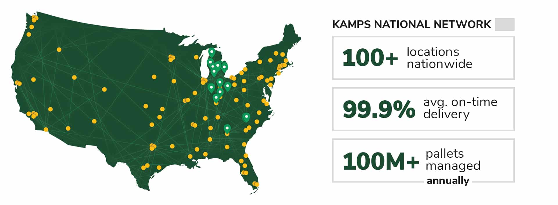At Kamps Pallets, we pride ourselves on the strength of our national network. We have over 100 strategically placed locations nationwide. These locations live and breathe the Kamps Pallets way. That means that the repair, building, and inspection process is standardized and completed the same way. This is extremely important for businesses with multiple locations across the U.S. These businesses expect and deserve the same quality of service and product across the board; and with Kamps Pallets that is exactly what we achieve.